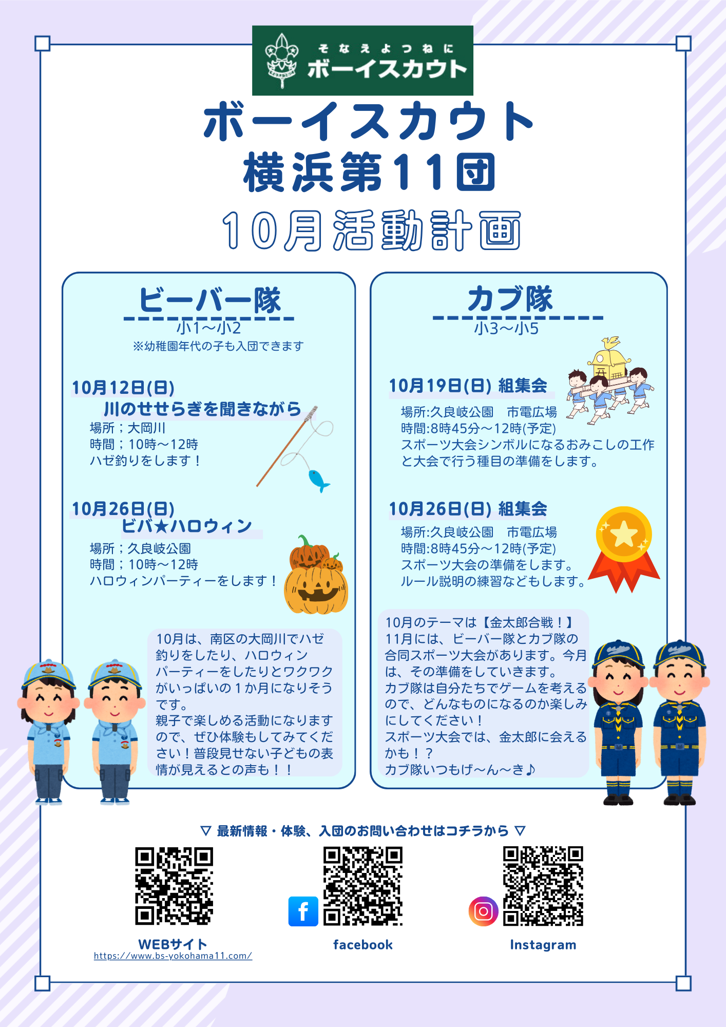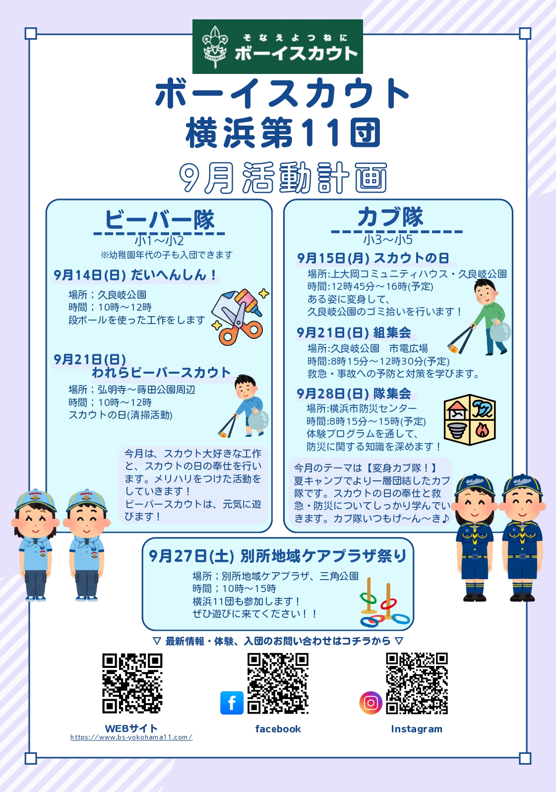 このホームページ上のスカウト運動に関する事項は、ボーイスカウト日本連盟ホームページ掲載「ボーイスカウト関係のホームページ開設」に沿って、みなと地区 横浜第11団 風間団委員長の責任のもとに広報委員会が運営しています。
